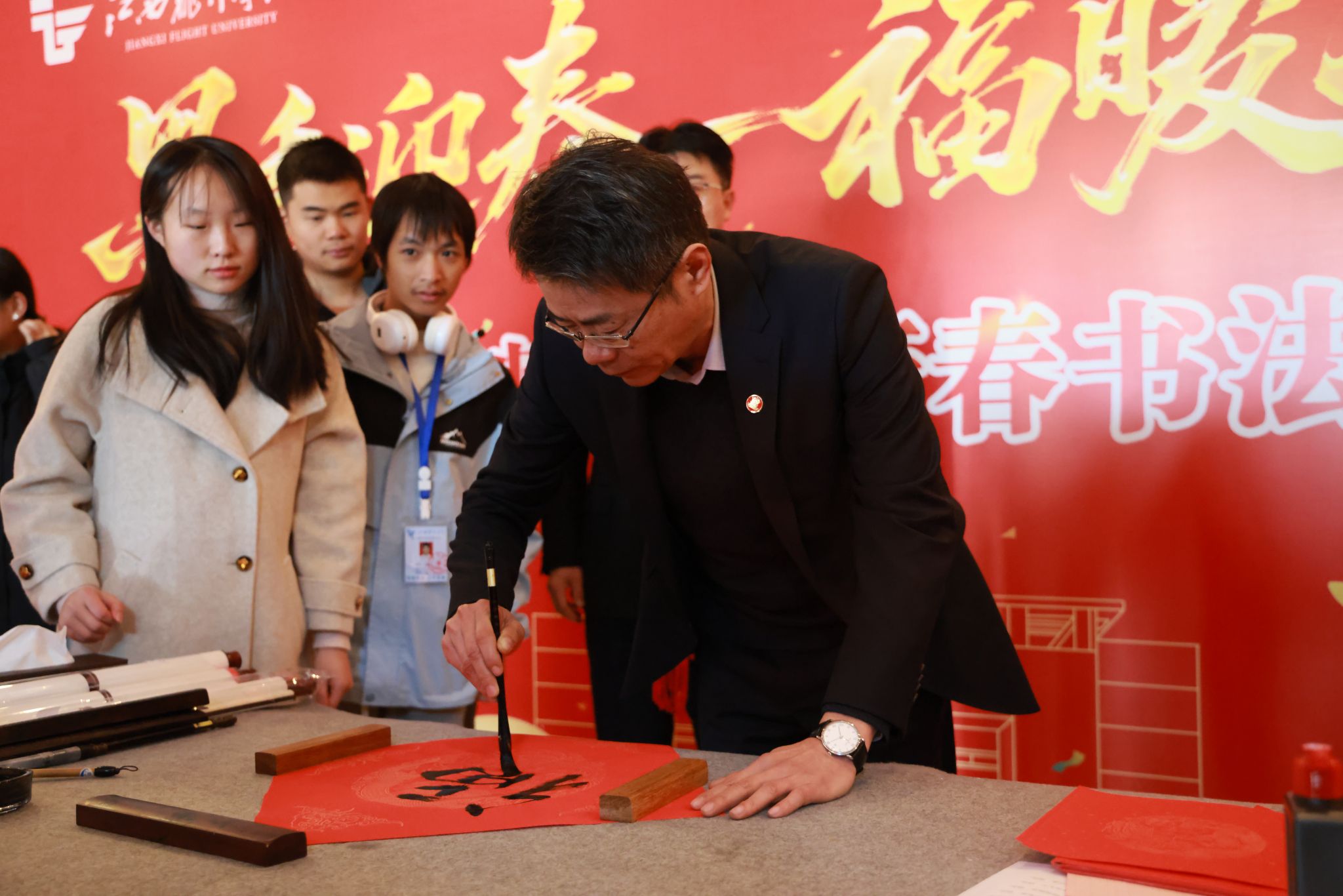 1月7日中午,由校工会、校团委联合承办的“墨香迎春·福暖江飞”师生迎新春书法活动在培训楼大厅举行,校党委书记陈震,校长龙国英,校党委副书记张海涛,党委委员、副校长郭军华和400余名师生代表参加了此次活动。