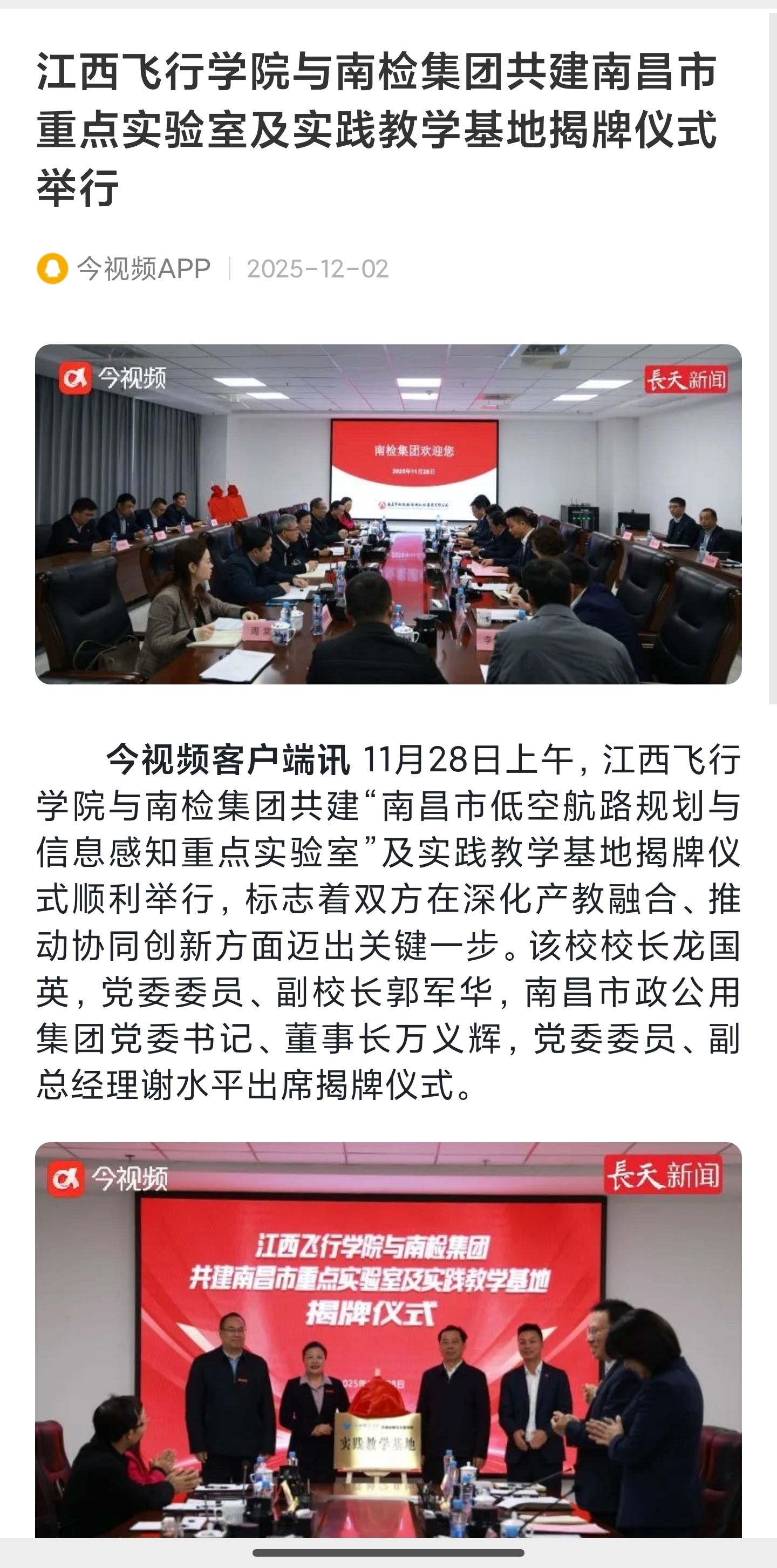 近日,腾讯网报道,江西飞行学院与南检集团共建南昌市重点实验室及实践教学基地揭牌仪式举行详情如下: