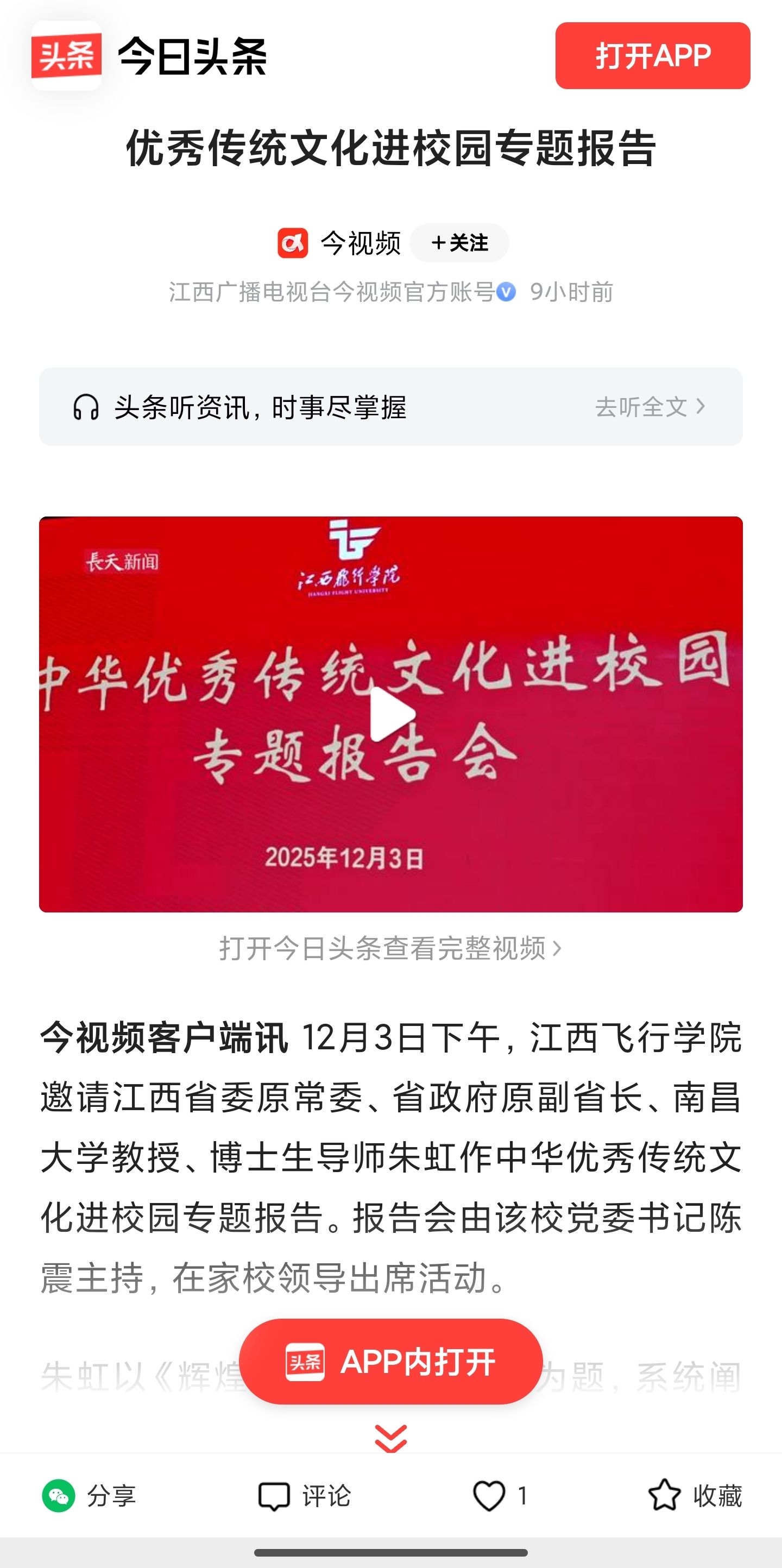 近日,今日头条报道,朱虹应邀来江西飞行学院作中华优秀传统文化进校园专题报告详情如下: