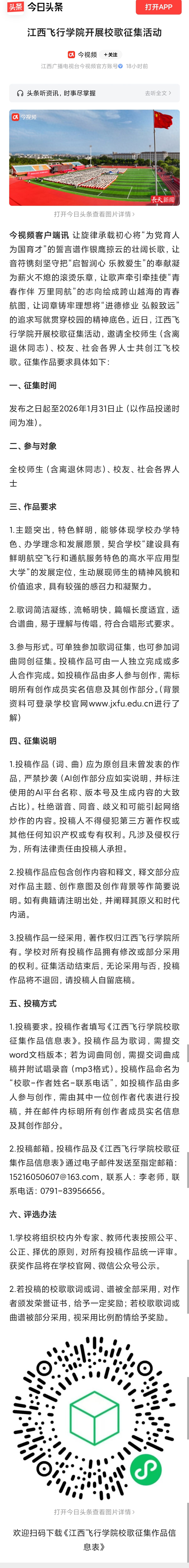 近日,今日头条报道,江西飞行学院开展校歌征集活动详情如下: